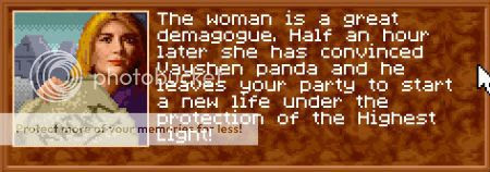 While investigating the town, a Praios preacher approaches the team and manages to convert Vayshen Panda who immediately quits the adventuring life and leaves the party in one of the most WTF moments ever.